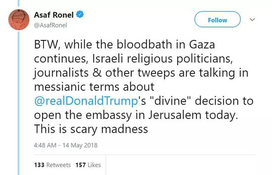 与此同时,在耶路撒冷,以色列人正在兴奋地等待着美国驻耶路撒冷的新使馆开馆的一刻。以色列国土报的一位记者还描述说,以色列的政客和宗教领袖们正在称赞着特朗普做出的这一“神圣”的决定,甚至还有人把他视作“救世主”。