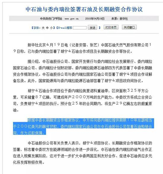 公开报道显示,2010年时,中委签署了《中委长期融资合作框架协议》,把中委之间的这种合作模式进一步确立下来。这份协议显示,中方将向委内瑞拉提供期限10年总额相当于200亿美元的融资贷款,委内瑞拉国家石油公司与中石油股份公司签署石油购销合同,作为还款保障。