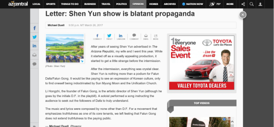 2017年3月26日,来自亚利桑那州凤凰城的读者迈克尔·迪尤尔(Michael Duell)致信亚利桑那中部网(azcentral.com),直指“法轮功”神韵是一场欺骗性演出,并曝光神韵演出的幕后推手、所谓的艺术总监,就是化名D.F.的法轮功邪教头目李洪志。他说:“过了中场,一切都再明显不过,神韵完全是场法轮大法(法轮功)的讲台。