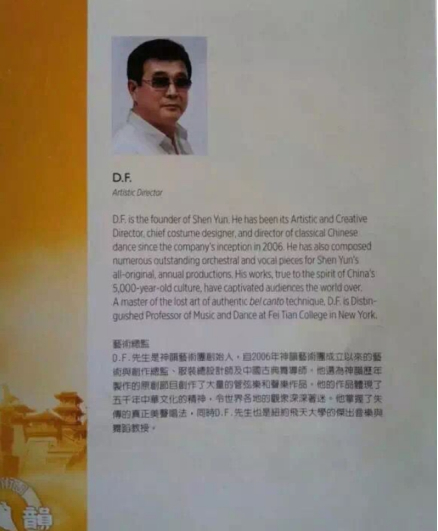 不甘寂寞的法轮功邪教头目李洪志名利熏心,戴着墨镜耍起“艺术范儿”,鬼鬼祟祟化名D.F.,在神韵节目单上摆出“艺术总监”架式(图片源自互联网)