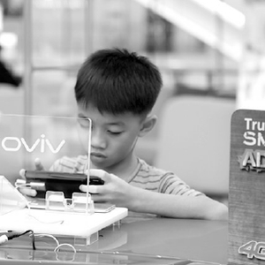 一个小孩在泰国电信运营商门店内用vivo手机玩游戏。