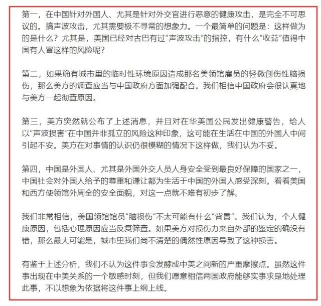 而我们《环球时报》在昨晚的社评中则表示,中国也根本不可能并根本没理由对美国领事馆职员发动这极其不可思议的 “声波攻击”,我们还呼吁美国方面积极与中方配合调查此事,不要凭想象[上纲上线],而应[实事求是]。