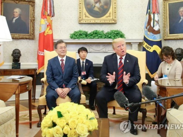 当地时间5月22日,在美国白宫,韩国总统文在寅(左)同美国总统特朗普共同会见记者。(图片/韩联社)