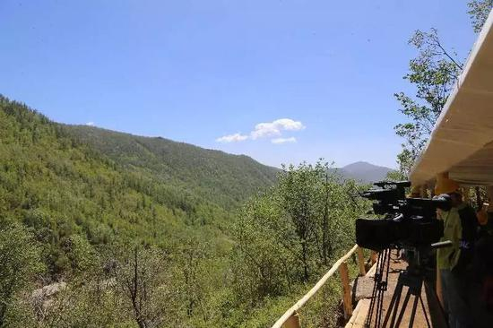 在听完介绍后,记者们先后进入了二号坑道口和四号坑道进行采访,坑道门口还有朝鲜军人在站岗,坑道口内密布的爆炸装置线路十分显眼。随后记者登上了朝方特意为此次采访活动而搭建的拍摄点之一——一座树立在山体上的木楼。