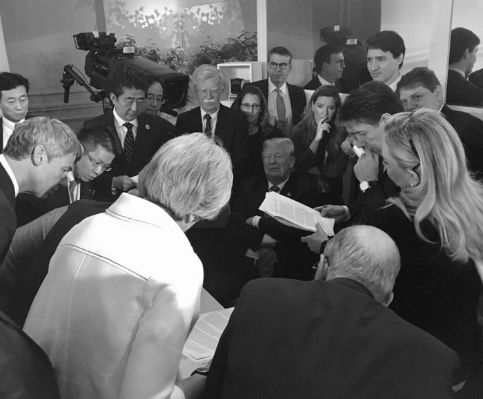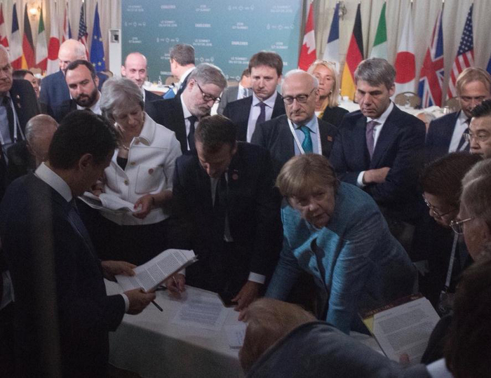 [环球网报道 记者 李慧玲]德国总理默克尔的团队9日晚在社交媒体发布一张七国集团峰会的照片,默克尔双手架于桌子上,几国领导人围特朗普而站,颇有“围攻”特朗普之势。由于本届峰会上,美国总统特朗普一个人把G7其他六国领袖都给“得罪”了,这张照片也被国外网友奉为本届G7峰会的“全场最佳”。
