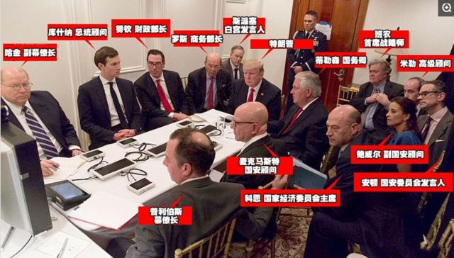 说到战情室,它设置于白宫西翼地下,之前在对拉登打击行动中,白宫一直对前方进行着实时监测,奥巴马等人就在战情室监测战事进展。2017年,美国白宫发言人斯派塞在推特上发布了一张照片。照片上,特朗普正在佛罗里达州的海湖庄园战情室听取有关美军对叙利亚空袭的情况汇报。