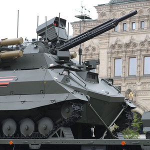 据报道,俄罗斯“天王星-9”于2016年推出,被设计为一款为俄罗斯地面部队提供支持的火力支援无人车(UGV),长度16.7英尺(约5.09米),重约10吨。“天王星-9”配备有强大火力,包括一门30毫米口径2A72自动火炮和4枚9M120-1“攻击”(Ataka)反坦克导弹。从理论上来说,这款战车对于步兵、轻型装甲车甚至主战坦克都具备强大打击能力。