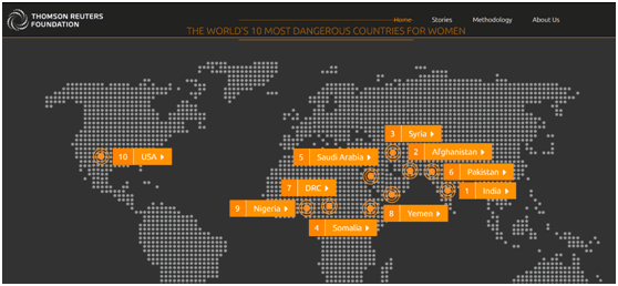 据报道,汤姆逊路透社基金会(Thomson Reuters Foundation)在针对女性议题访问了大约550名专家后,得出的调查报告显示,遭战争蹂躏的阿富汗和叙利亚分居第2、3名,索马利亚和沙特阿拉伯排第4和第5。