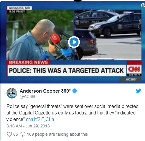 克兰普夫表示,“这是一次针对《首府新闻报》的目标袭击。”克兰普夫在新闻发布上说,“这个人做好了开枪的准备,他的意图就是造成伤害。”美国新闻宣传组织对此表示,“针对记者的暴力行为是不能接受的”。
