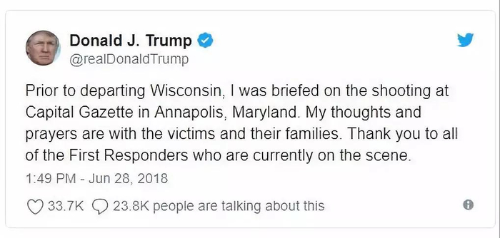 美国总统特朗普当天下午在推特上向枪击案中的警方及急救人员表示感谢,并对遇难者表示哀悼。