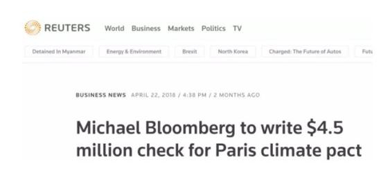 就拿最近来说,4月份的时候,他自掏450万美元给《联合国气候变化框架公约》秘书处,为补足因为川普退出《巴黎协定》而造成的资金缺口。