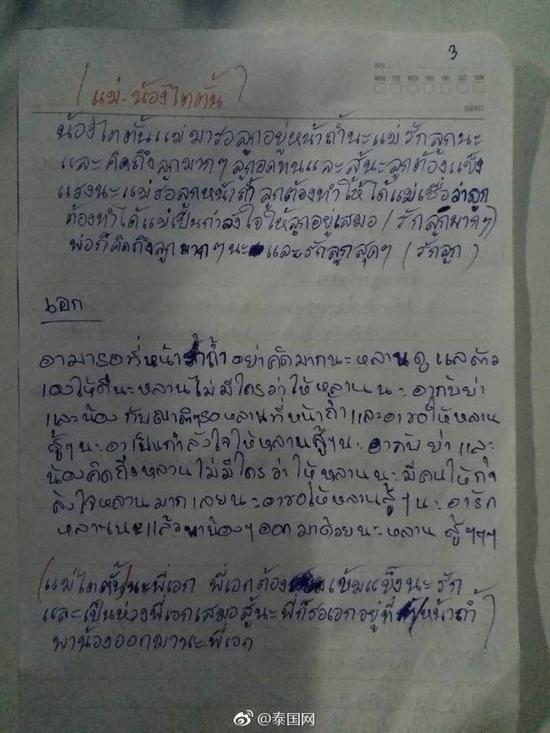 此外,被公开的还有受困少年们的信。他们在写给家人的信中看起来平静而让人放心。一位“吃货”少年还惦记着炸鸡:“爸爸妈妈,请不要担心,我很好。等我出去带我去吃炸鸡。”
