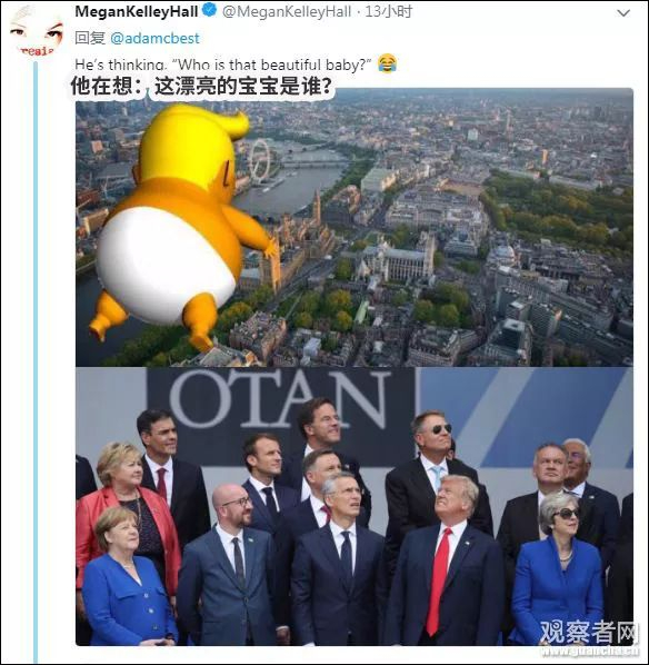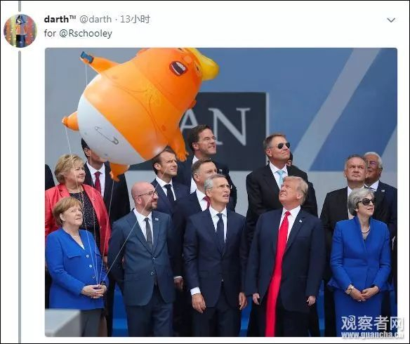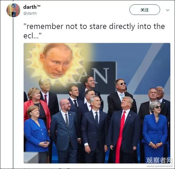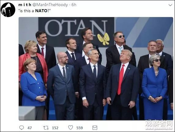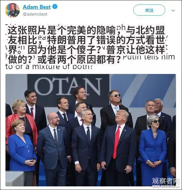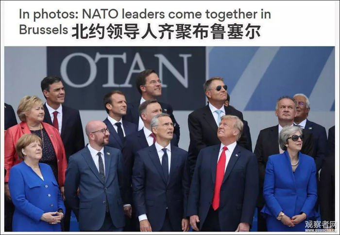该照片目前已经被西方各大主流媒体使用,作为其报道北约峰会的头图,比如美国《新闻周刊》、《时代》等。