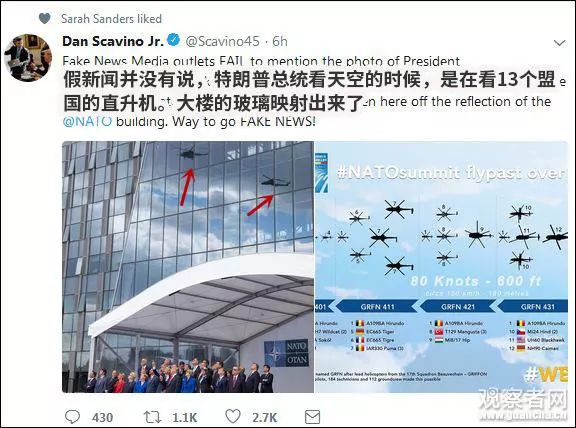但是,白宫社群媒体主任史卡比诺 (Dan Scavino Jr。)却站出来指责“假新闻”。他表示,当时各国领导人正在抬头看天空中飞过的13国直升机,并配上了一张动作整齐划一的照片。