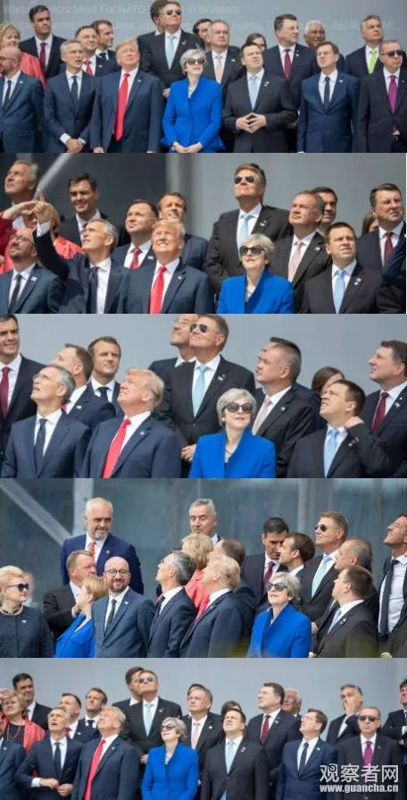 而这张神奇的照片里,几乎所有人,包括法国总统马克龙、德国总理默克尔、英国首相特蕾莎·梅这些“老朋友”,都看向自己的左边,而特朗普则执着地望向右边的天空。