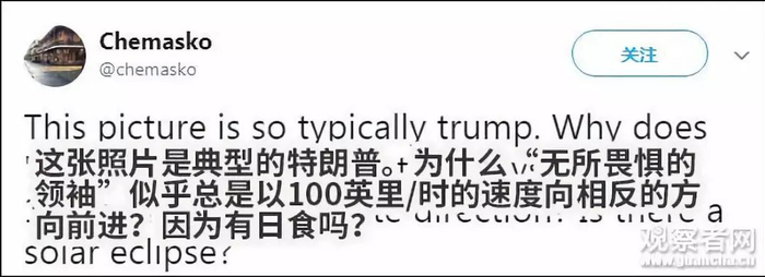 于是,有人从这张照片中读出了点政治隐喻,又扯上了美国国内怀疑特朗普“通俄”的阴谋论:
