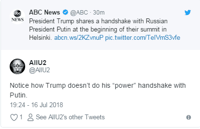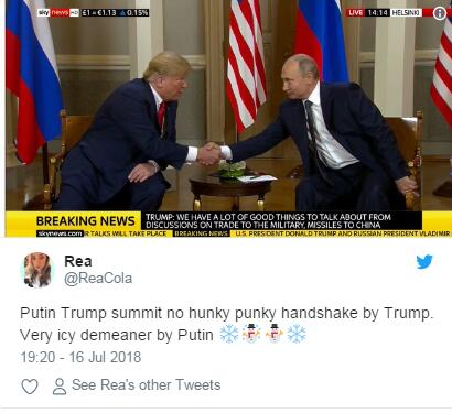 美国ABC新闻网分享了特朗普和普京握手的情景,网友称:“注意一下特朗普没有‘发力’和普京握手。”