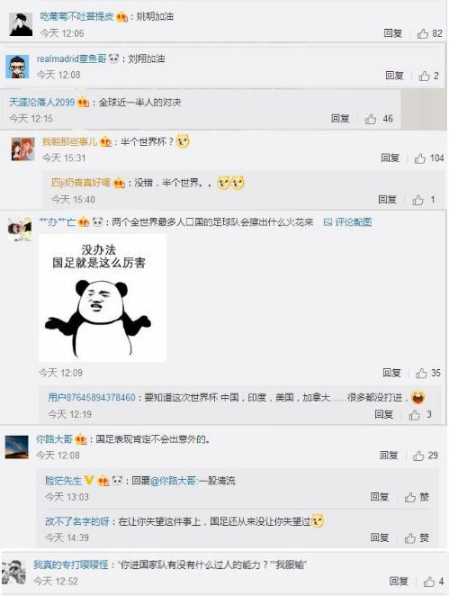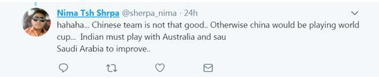 网友@sherpa_nima:哈哈哈……中国队踢得不怎么好,否则中国就会去踢世界杯了。印度应该和澳大利亚或者沙特踢,这样才能提高。