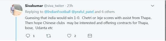 网友@siva_twiter:我猜比分将是印度1:0获胜,进球的会是Chetri或者Jeje,助攻的会是Thapa,希望中国俱乐部能够对Thapa和Udanta这些球员有兴趣,并给他们合同。