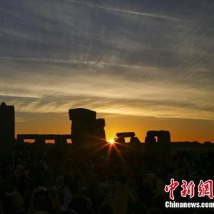 当地时间6月21日,英国英格兰威尔特郡,人们聚集在巨石阵附近观看日出,迎接夏至日到来。