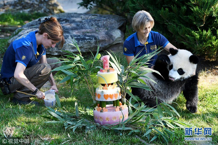 当地时间2018年8月4日,法国博瓦尔动物园,在法国出生的第一只熊猫宝宝“圆梦”迎来1岁生日,它的父母是“欢欢”和“圆仔”。 (图片来源:视觉中国)