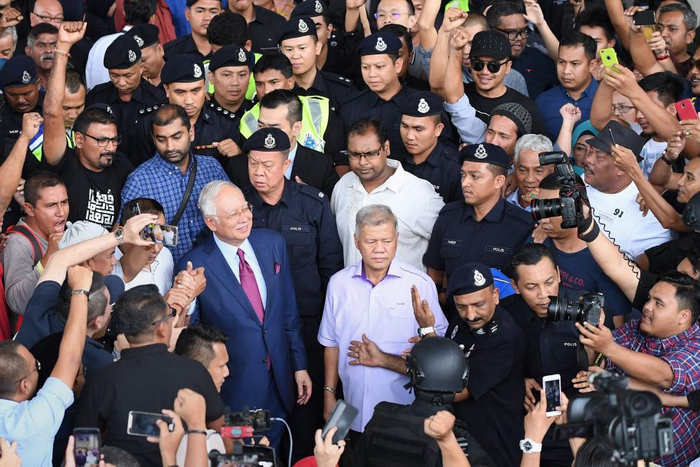 7月4日,在马来西亚吉隆坡,前总理纳吉布(中)获得保释后离开法院。马来西亚前总理纳吉布4日被检方提起公诉,罪名为贪污和背信罪,但纳吉布否认有罪。新华社/法新