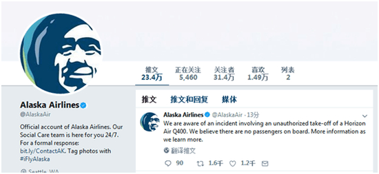 [环球网报道 记者 查希]据美国广播公司(ABC)8月11日报道,美国阿拉斯加机场官方推特发文称,发现一架非经授权的飞机起飞,飞机机型为Horizon Air Q400。