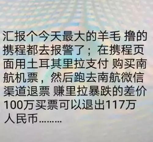 还有一个网络流传的致富的捷径,用里拉支付购买土耳其的机票,再通过微信退票,100万人民币的购票款,可以退回117万人民币。不要看着眼红,这和你也没有多大关系。