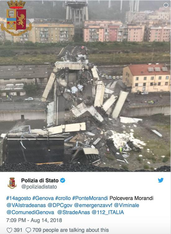据悉,肇事天桥被称为“莫兰迪桥”(Morandi bridge),建于1960年代,被认为是欧洲有史以来建造的第一座斜拉桥。“莫兰迪桥”长约1公里,距离地面高度90米,在2016年重新修建,是当地A10公路的一部分。