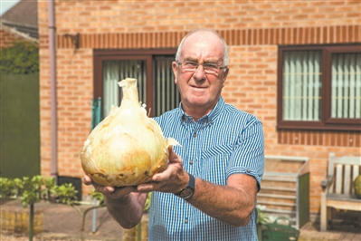 | 英国老人戴维·斯托瑟德手拿一个超大洋葱。@视觉中国 |