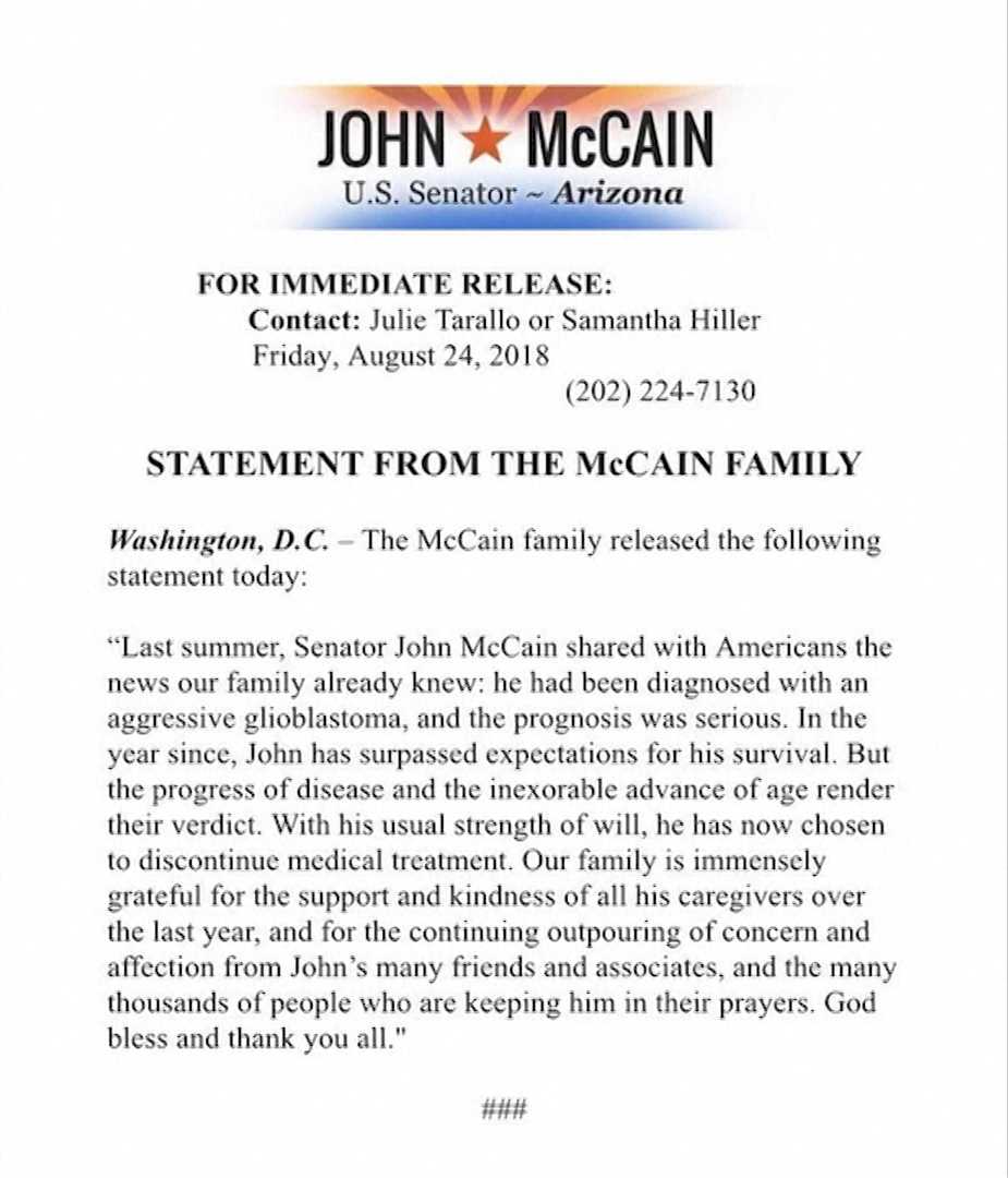8月25日,美国共和党资深参议员麦凯恩因脑癌去世,终年81岁。之前,他家属已经宣传放弃治疗。