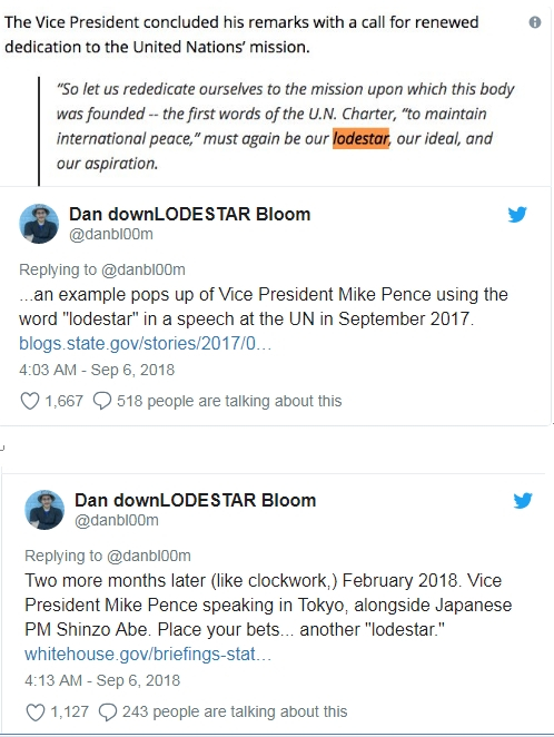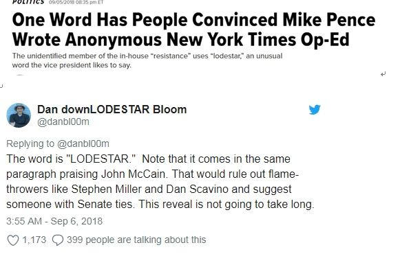 原来,眼尖的网友称,作者在文章中特别提到了过世的重量级参议员麦凯恩是一颗北极星(lodestar),而北极星是彭斯经常在演讲中用到的一个词。该网友发了若干条推特提供“证据”