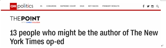 这篇文章的作者究竟是谁呢?美国有线电视新闻网(CNN)编辑列出了13个人名,其中包括白宫办公厅主任凯利,特朗普女儿伊万卡,特朗普妻子梅拉尼娅,国防部长马蒂斯,副总统彭斯等等。