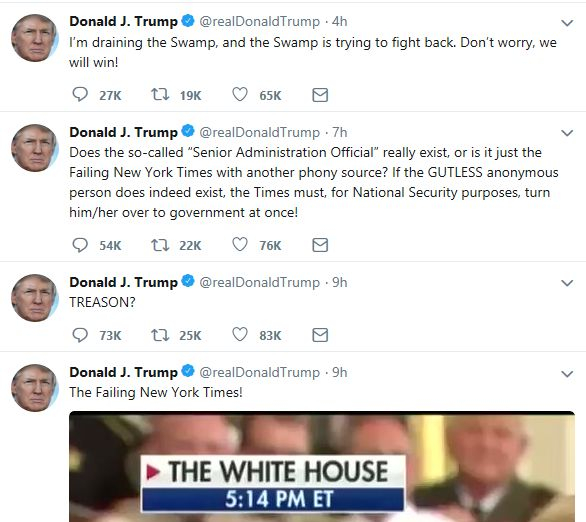 他先是在当天下午的警长会晤中回应称匿名作者“没种”,其后连发4条推特,指责文章作者“叛国”,还质疑这个“政府高级官员”是否真实存在,称如果真实存在,那“为了国家安全,《纽约时报》应立即将其交给政府”!