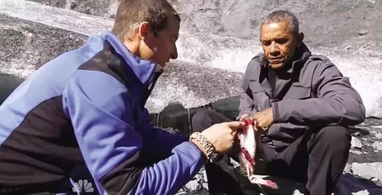 节目显示,奥巴马和贝尔在深入阿拉斯加州荒原时,在苔藓下发现了疑似阿拉斯加熊藏着的吃了一半的生鲑鱼。贝尔刮下一块带血的鱼肉塞到了奥巴马的嘴里,品尝后的美国总统相当满意地说“好吃”。