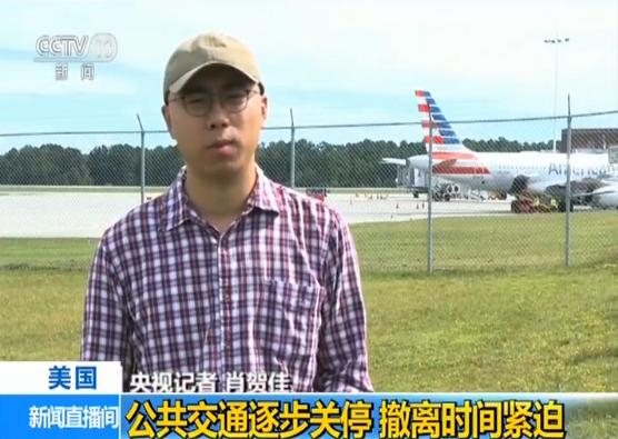 央视记者 肖贺佳:这里是北卡罗来纳州威尔明顿当地的机场,这里今天最后一个航班是下午6点08分,飞往北卡罗来纳州夏洛特。受到飓风的影响,这个机场今晚将关闭,最早到15日,也就是本周周六才会重新开放。据当地媒体报道,截至目前,仅仅美国航空一家航空公司一直延伸到17日的565架次的航班都已经取消。