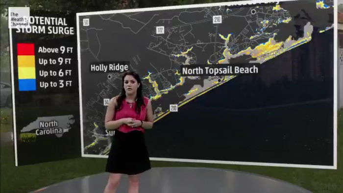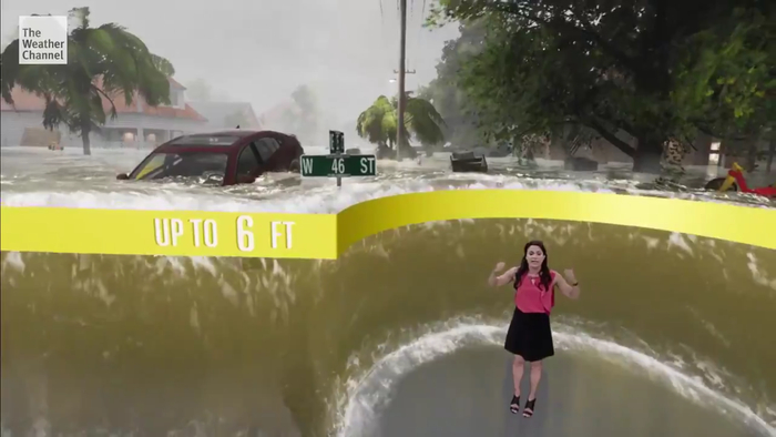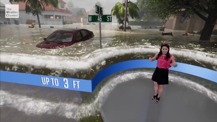 为了更直观的表达,在特效加持下,身处摄影棚的纳瓦罗(Erika Navarro)“转场”至北卡罗来纳州的一处街道,接着“洪水”开始泛滥。纳瓦罗说道,“当水位达到我的手腕时,就构成了灾情的第一级,可能会把你冲走。”此时,画面显示水位为0.91米。