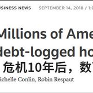 路透社9月14日报道,虽然遭受“次贷危机”重创的地区,如拉斯维加斯、匹兹堡和克利夫兰等“铁锈带”的城市财富有所增加。但截至今年6月30日,全美仍有近十分之一(9.3%)的抵押贷款房屋“严重资不抵债”,这意味着这些房产的市值比抵押贷款余额至少低25%。