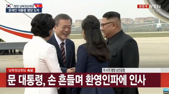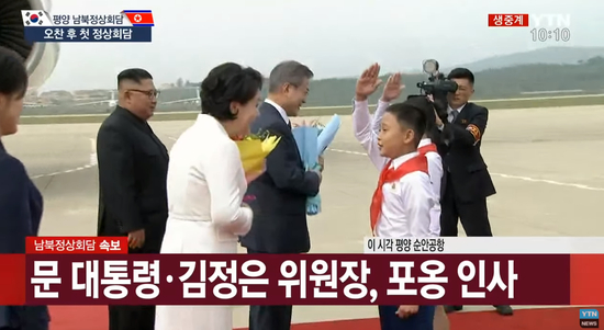 直播画面显示,文在寅夫妇下飞机后,走到在红地毯等候的金正恩伉俪面前,与他们热情拥抱握手。
