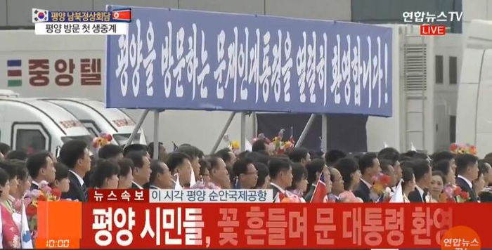 原标题:平壤机场现大型手举牌:热烈欢迎文在寅到访平壤