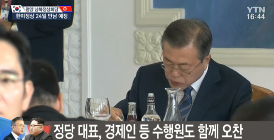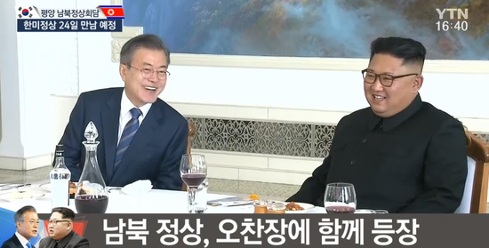 今年4月27日,文在寅在板门店韩方一侧“和平之家”3楼,为金正恩和其夫人举行晚宴。其中玉流馆冷面是文在寅所点餐品。朝方派玉流馆首席厨师到板门店朝方一侧的“统一阁”亲手制作冷面,之后将其送至“和平之家”。(编译/海外网 刘强)