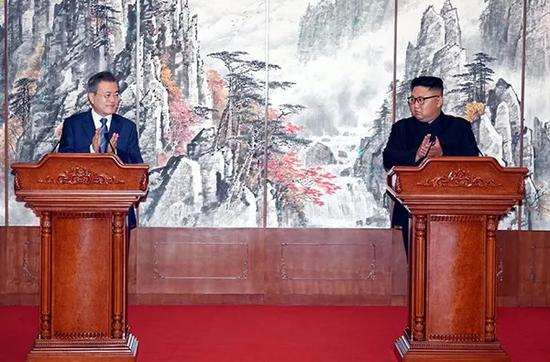 今天,两位领导人签署《共同宣言》,并举行联合记者会。在记者会上,金正恩说,朝鲜将变成没有核武器的和平之地;文在寅也说,韩半岛不久后就能实现永久性无核化。之后青瓦台更是表示,韩朝发表《平壤共同宣言》事实上宣布战争状态结束,并提出实现和平、共同繁荣的具体方案。
