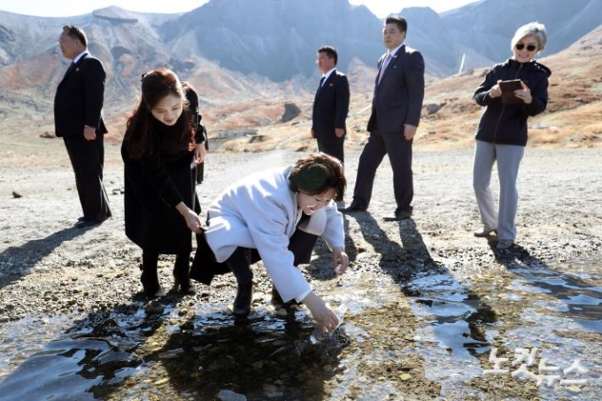 韩国总统夫人金正淑:我带了汉拿山的水来,将一半倒入天池中,再带半瓶天池水回去。