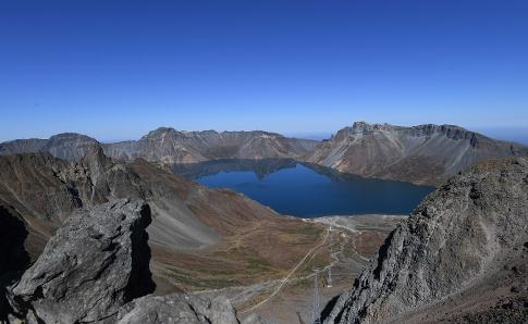 注:长白山是一座休眠火山(中国称长白山,朝鲜称白头山),火山口积水成湖,被16座山峰环绕,仅在天豁峰和龙门峰间有一狭道池水溢出,飞泻成长白瀑布,是松花江的正源。天池像一块瑰丽的碧玉镶嵌在长白山群峰之中,平均水深204米,最深处达373米,是中国最大的火山湖,也是世界上最深的高山湖泊,现为中朝两国的界湖。