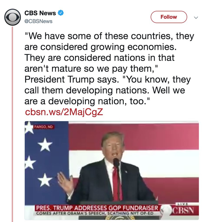 “美国是发展中国家”。是的,你没看错,而且这句话出自美国总统特朗普之口。