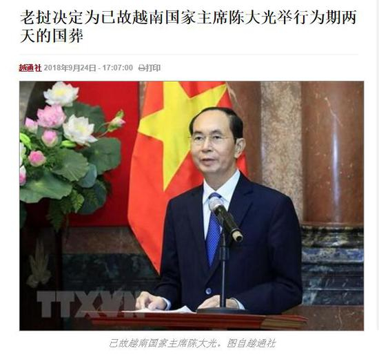 [环球网综合报道]越通社9月24日援引驻老挝记者消息报道称,老挝总理府办公厅于9月24日下午发布通知,将在老挝全国范围内为已故越共中央政治局委员、越南国家主席陈大光举行国葬。
