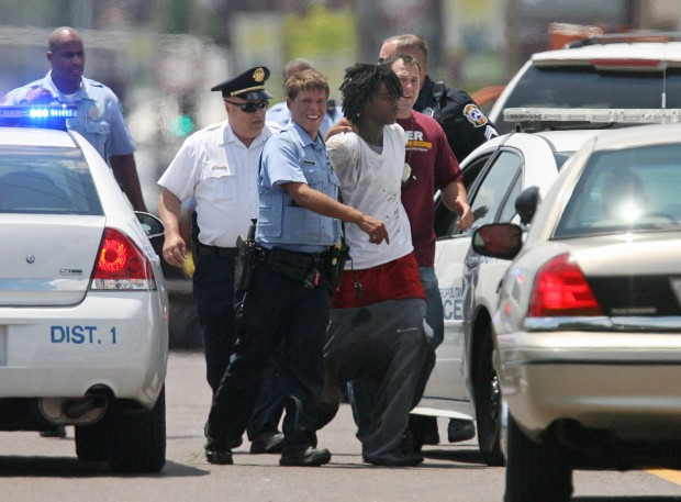 2012年7月10日,圣路易斯警方逮捕一名涉嫌入室抢劫杀人的疑犯。图自《圣路易斯邮报》