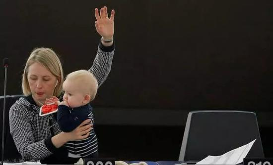 2017年3月14日,法国斯特拉斯堡,欧洲议会的瑞典女议员Jytte Guteland带着婴儿出席。她也是一边投票,一边抱着婴儿玩耍,工作逗娃两不误。