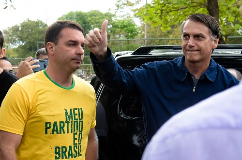 10月7日,在巴西里约热内卢,巴西总统候选人博尔索纳罗(右)到达投票站。新华社/圣保罗通讯社