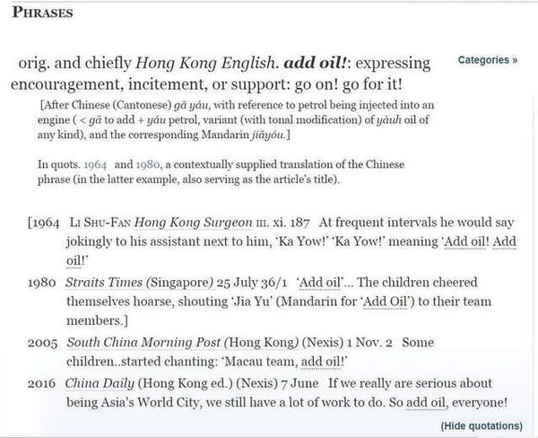 皇天不负苦心人,这一次终于让我发现了“加油”的踪迹。不过有点意外的是,“加油”并不是以音译的jiayou进入OED,而是直译的add oil。